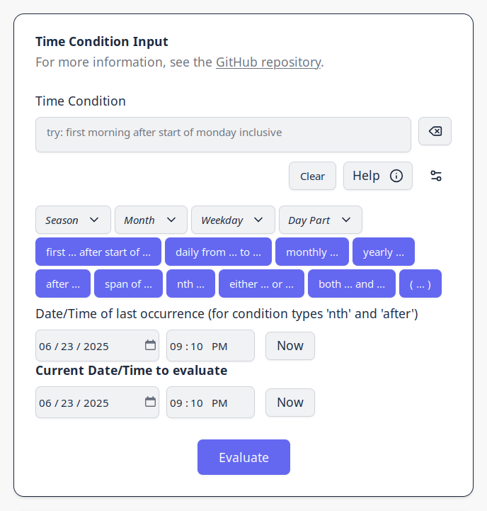 This post introduces timecond, a TypeScript library I created to represent, evaluate, and describe complex conditions on time ranges. The support for time ranges is what makes it different from many other popular time scheduling libraries that focus on events (points in time).